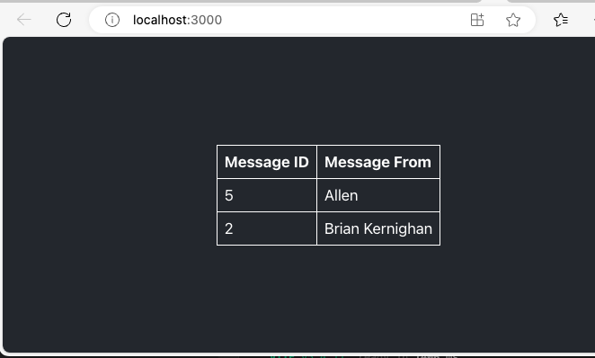 Upon inserting the new row into the database table, the React page should reflect the changes like shown in the screenshot below: