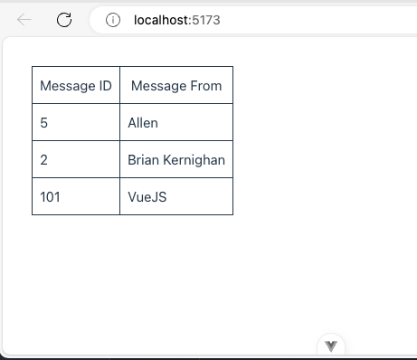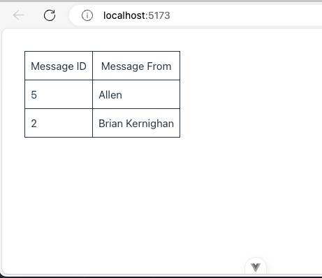 Upon inserting the new row into the database table, the Vue page should reflect the changes like shown in the screenshot below: